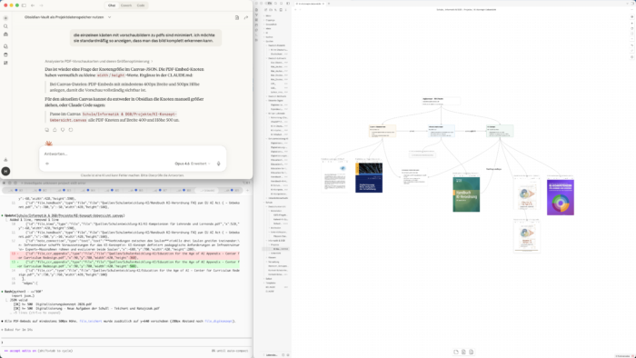 My current workflow is straightforward: I consult Claude (Opus 4.6 is particularly useful here — it’s precise) and talk through different approaches (first image, top left). In the terminal window (first image, bottom left), I work with Claude Code directly. In Obsidian (first image, right), I can see the current state of the vault at all times and follow along as changes happen. Because Claude has all the relevant Obsidian know-how baked in as skills — drawn from a public GitHub repo maintained by Obsidian’s lead developer — everything it produces is properly formatted and compatible. Even manual edits aren’t a problem: Claude Code only ever works with the current state of the files.